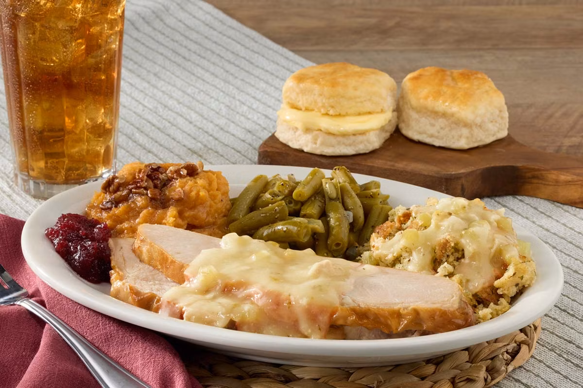 Roasted turkey with classic dressing, covered in rich turkey gravy for a comforting homestyle meal. Served with your choice of two country sides, along with warm hand rolled buttermilk biscuits or corn muffins. For a perfect pairing, try it with sweet potato casserole and green beans.